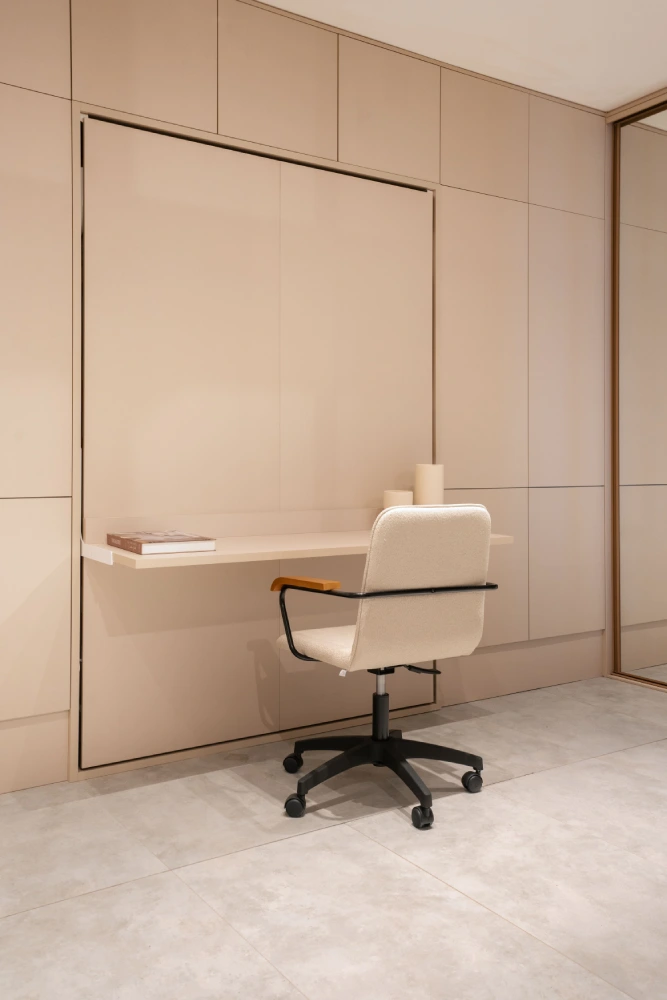 - Home office multifuncional: em um quarto pequeno, uma parede pode ser dedicada a um sistema giratório que inclui a cama e uma mesa. Isso permite que o espaço seja usado tanto como escritório quanto para dormir. E uma iluminação distribuída em vários pontos de luz proporciona uma luz suave e eficiente, tendo a densidade adaptável tanto para momentos de foco, como de relaxamento.